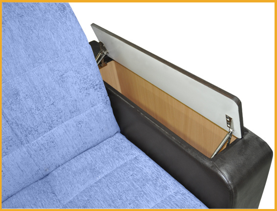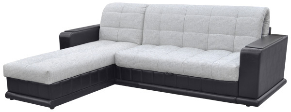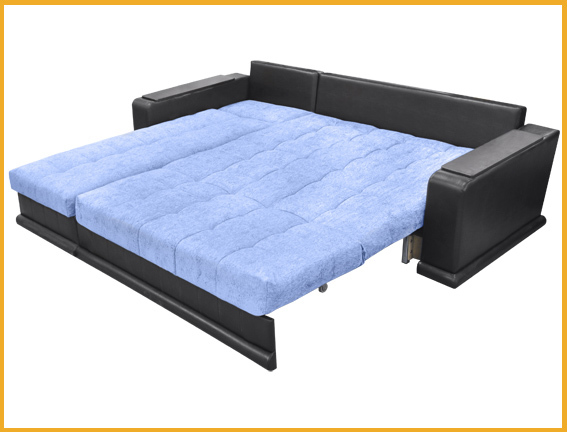 Современный стиль. Ровное спальное место. В основании дивана металлический каркас с поддерживающими деревянными латами. Матрас на эластичном ППУ. Спальное место формируется следующим образом: цокольная часть сиденья выдвигается вперед до упора, спинка, состоящая из сложенного листового пенополиуретана, раскладывается. Для удобства присутствует задняя спинка в режиме спального места. Возможность использования в качестве центрального объекта интерьера. Для трансформирования не требуется расстояние между стеной и диваном. В коробчатом основании дивана (оттоманке) расположена емкость для хранения постельных принадлежностей из ламинированного ДСП.Столешницы подлокотников открывающиеся, под ними располагаются дополнительные ниши для полезных мелочей. Угол дивана сменный. Механизм раскладки "Аккордеон".