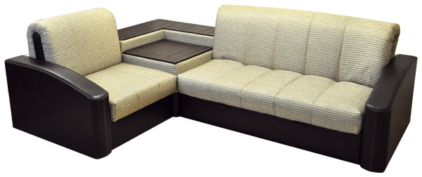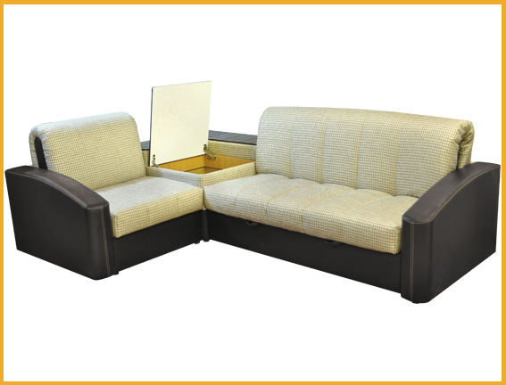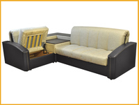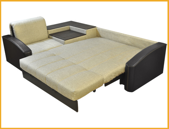 Современный стиль. Ровное спальное место. В основании дивана металлический каркас с поддерживающими деревянными латами. Матрас на эластичном ППУ.  Спальное место формируется следующим образом: цокольная часть сиденья выдвигается вперед до упора, спинка, состоящая из сложенного листового пенополиуретана, раскладывается. Для удобства присутствует задняя спинка в режиме спального места. Возможность использования в качестве центрального объекта интерьера. Для трансформирования не требуется расстояние между стеной и диваном.  В коробчатом основании углового сектора и кресельного сегмента  расположены емкости для хранения постельных принадлежностей из ламинированного ДСП. Угол дивана сменный. Механизм раскладки "Аккордеон".