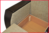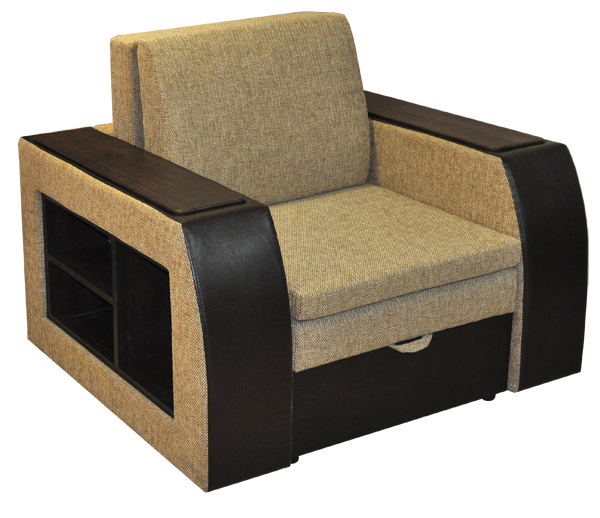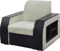 Современный стиль. При трансформации не требуется расстояние между стеной и спинкой кресла- кровати. В разложенном виде  получается ровное односпальное место. В основании спинки и сиденья деревянная рамка, на которую кладется  эластичный пенополиуретан. Для удобства присутствует задняя спинка. Декоративные накладки на подлокотниках из МДФ. В нише подлокотников расположены полки из ламинированной ДСП. В основании кресла присутствует емкость для хранения постельных принадлежностей. Подлокотники съемные. Кресло- кровать комплектуется съемной приспинной подушкой из формованного пенополиуретана. Механизм раскладки "Юниор". Чехол у подушки съемный.